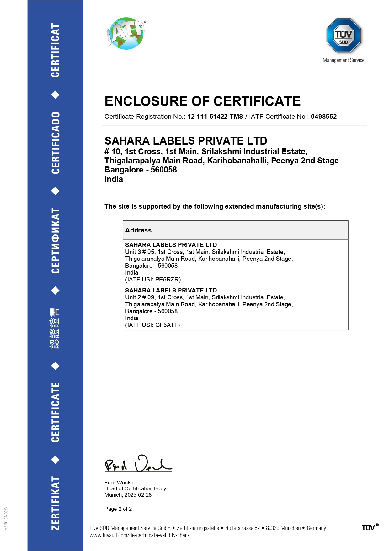 Sahara Labels Pvt. Ltd. maintains internationally recognized certifications that demonstrate our commitment to quality, safety, information security, and regulatory compliance. These certifications ensure our manufacturing processes consistently meet global automotive and industrial standards.